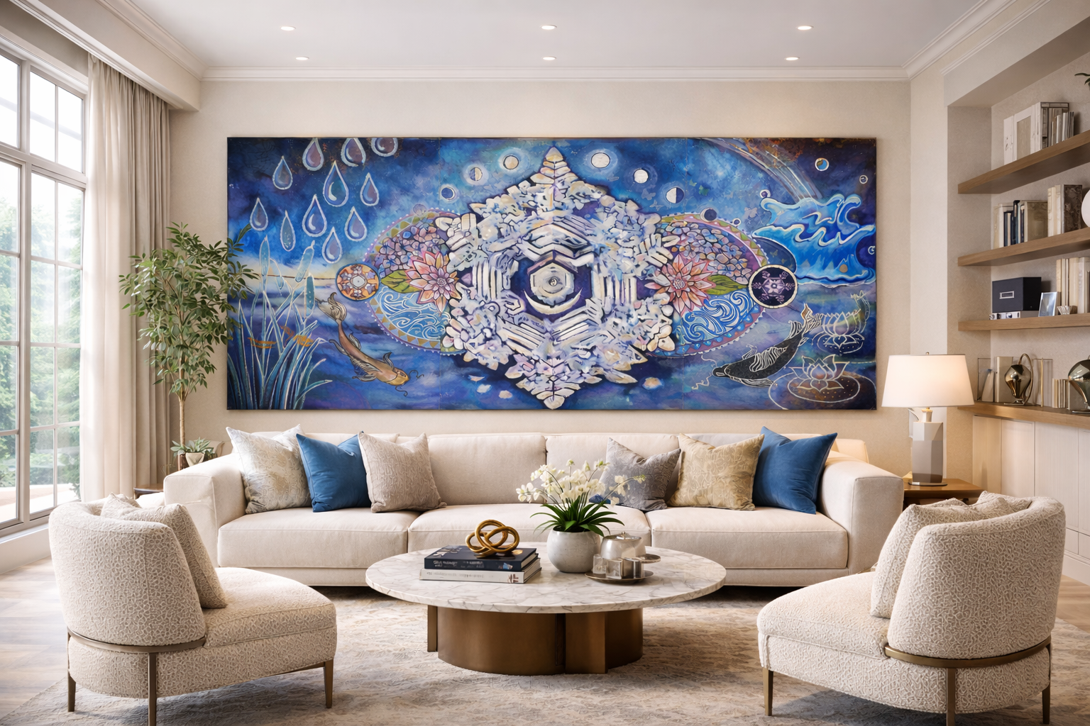 “Water is Life” 4’ x 12’ acrylic on wood - At the heart of Water is Life sits a crystalline form inspired by the work of Japanese scientist Masaru Emoto. This crystal reveals the vibration of the word LOVE as seen under a microscope after a meditation—a reminder that intention shapes the very structure of our world. Flowing with lotus, koi, rain, and celestial cycles, the piece becomes a meditation on renewal, harmony, and the sacred intelligence carried within water—and within us.